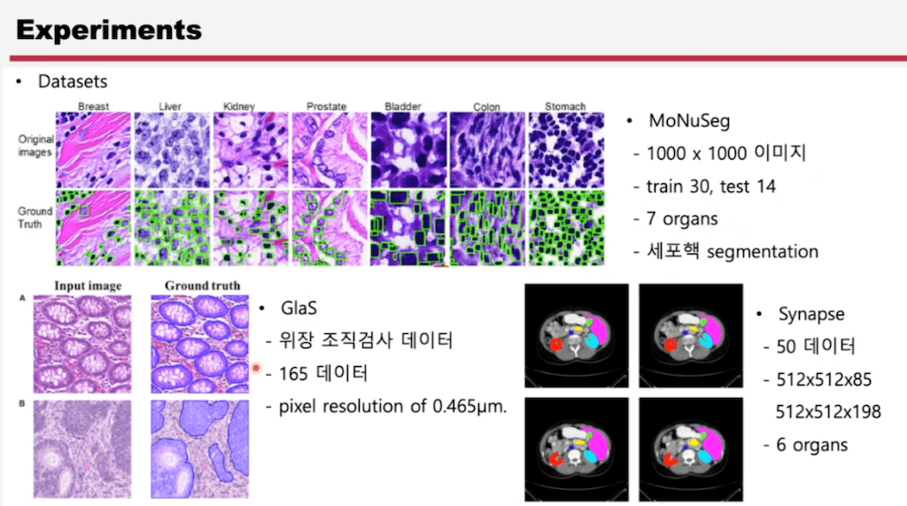 - GlaS는 염색을 해서 세포를 현미경으로 바라본 데이터셋입니다. 위장의 조직 검사 데이터셋이고 165개 데이터, 그리고 픽셀마다 0.465 마이크로미터입니다.