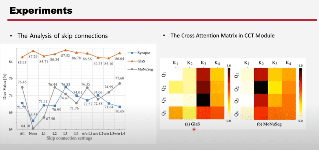 GlaS는 depth가 세 번째에서 가장 유사한 similarity가 나오는 걸 확인할 수 있습니다. 동일하게 GlaS 데이터셋에 대해서 layer 세 번째 거를 뺐을 때 가장 낮은 것을 확인할 수 있습니다. 그리고 가장 similarity가 높은 레이어에서만 Skip connection을 넣었을 때 성능이 가장 좋은 것을 확인할 수 있습니다.