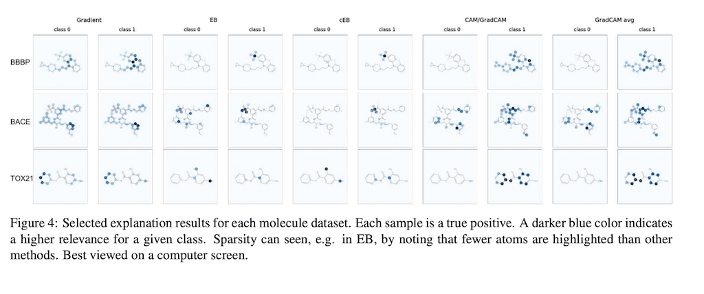 각 분자 데이터셋에 대한 설명 결과입니다. 그림에서 진한 파란색은 기본 class에 대한 relevance가 더 높다는 것을 나타냅니다. 예를 들어 EB에서 Sparsity는 다른 방법보다 적은 수의 원자가 강조된다는 점에서 확인할 수 있습니다.