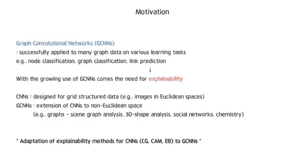 GCN는 node classification, Graph classification, link prediction과 같은 다양한 Graph 데이터 테스크들에 성공적으로 적용되고 있습니다. 따라서 Graph가 왜 이런 prediction을 했고 classification을 했는가에 대한 연구의 필요성이 대두되며 비교적 최근에 진행되고 있어 내부 논리와 의사 결정 과정에 대해서는 아직 제한된 이해만 갖고 있습니다.