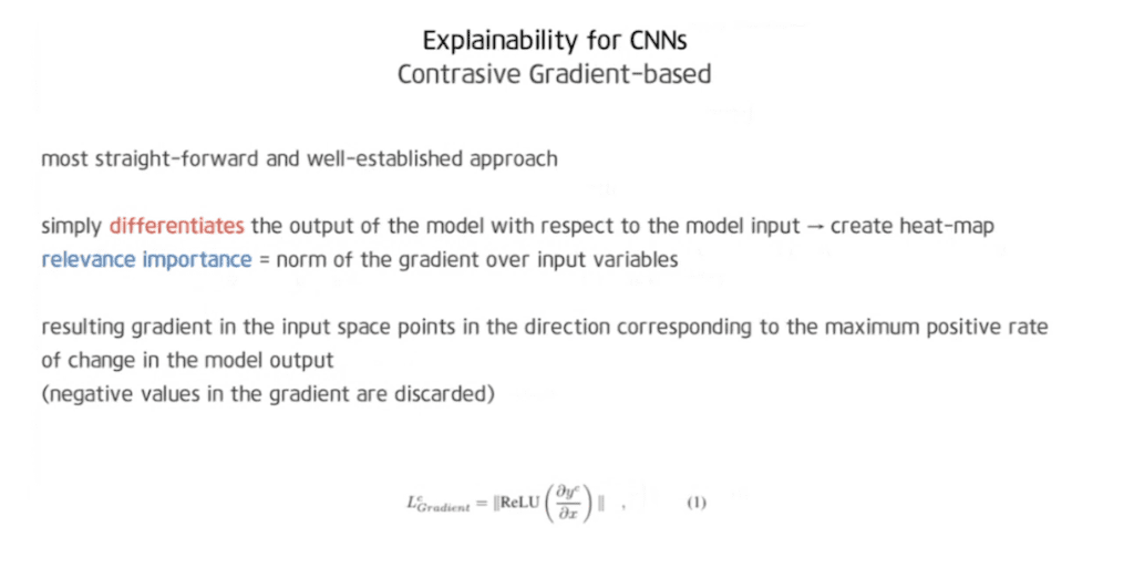 CNN XAI에서 주로 사용되는 기법은 4가지입니다. 입력 데이터에 대한 sensitivity map을 생성하는 가장 간단한 접근법은 각 네트워크의 가중치의 입력에 대한 gradient vector에 norm을 고려해서 layer 내에서 gradient map을 계산하는 것입니다. 그러나 gradient map은 노이즈가 심하며 이러한 map을 스무딩 하는 것이 필요로 할 수 있기 때문에 CAM, Grad CAM, EB는 일부 context의 notion을 고려해서 gradient map을 개선시키고 있습니다.