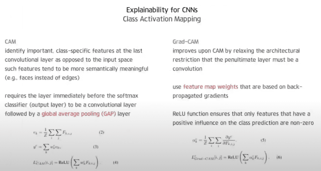Class Activation Map은 CNN의 마지막 Convolutional layer에서 중요한 class별 특징들을 식별하여 GCN을 포함한 Convolution 신경망에 대한 saliency maps보다 개선됩니다. CAM의 단점은 Gap layer가 반드시 필요하여 소프트맥스 레이어 이전에 여러 개의 fully connected layer가 있는 것과 같이 복잡한 네트워크를 사용할 수 없다는 점입니다.