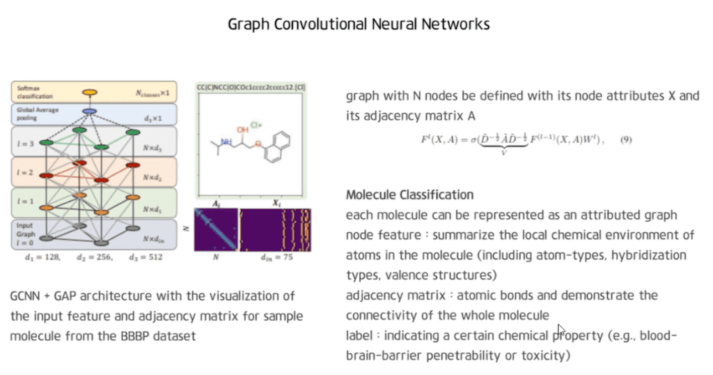 좌측 그림은 GAP 레이어가 포함된 GCN의 모델 아키텍처와 본 논문에서 사용한 BBBP 데이터셋에서의 샘플 molecule에 대한 인풋 feature Adjacency 매트릭스를 시각화한 그림입니다.