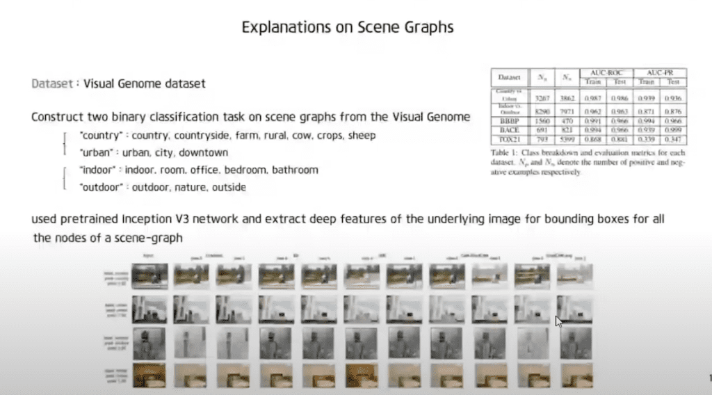 Scene Graph는 node가 Scene의 object이고 엣지가 object 사이의 관계를 나타내는 Graph structure 데이터입니다. 실험을 위해서 Scene Graph를 "country", "urban", 그리고 "Indoor", "outdoor"라는 두 가지 이진 분류 작업을 수행하였습니다.