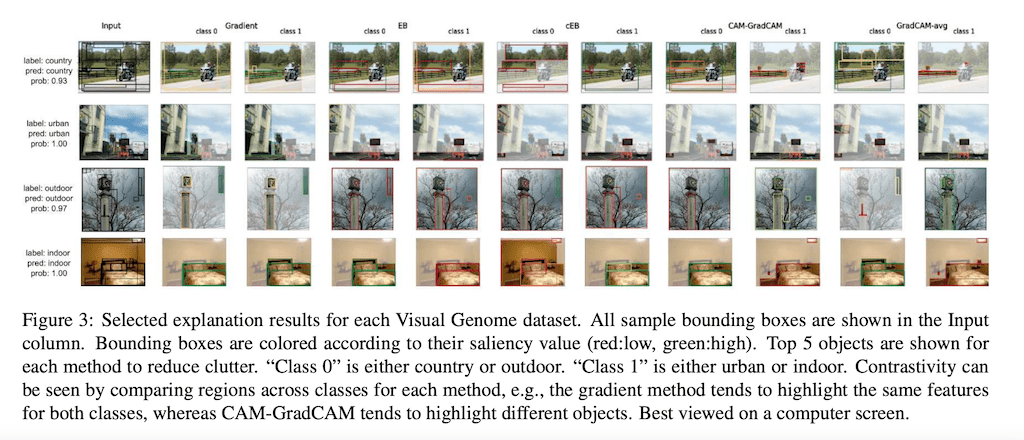 visual G는 데이터셋에 대한 결과입니다. 모든 샘플 boundingbox가 인풋 컬럼에 표시됩니다. 박스의 색깔에 따라 salience 밸류가 달라지는데 빨간색은 낮고 초록색은 높다는 것을 표현하고 있습니다. class 0은 "country" 혹은 "outdoor"이며 class 1은 "urban"이나 "Indoor"입니다.