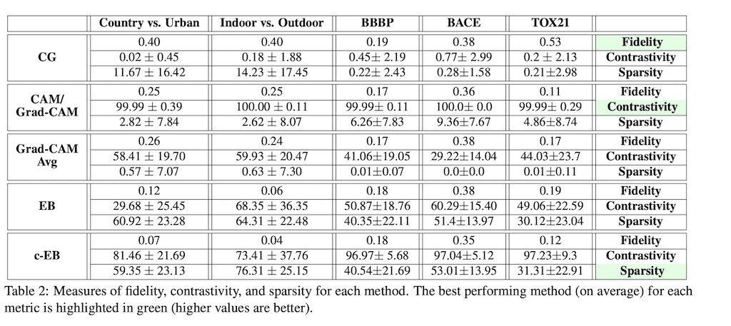 또한 본 논문의 저자들은 다양한 XAI 기법들을 Fidelity, Contrastivity, Sparsity라는 세 가지 정량적 지표를 통해 분석합니다. 먼저 fidelity는 설명을 통해 식별된 salience feature의 occlusion이 분류 정확도를 떨어뜨린다는 직관을 위해 계산되었습니다.