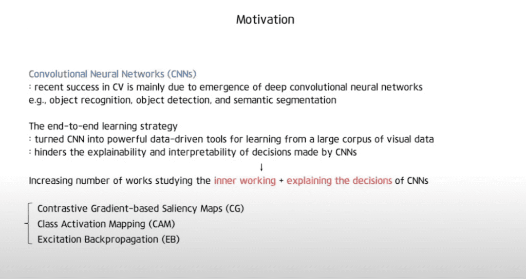 CNN은 object recognition, detection 등 다양한 Computer Vision task들에서 좋은 성능을 보여주고 있습니다. 이런 end-to-end learning strategy는 CNN을 대규모 visual data corpus에서 학습하기 위한 강력한 data-driven tools로 변화시켰지만 CNN 모델로부터 나온 결정에 explainability와 interpretability를 방해합니다. 따라서 최근 CNN은 내부 작동 방식을 연구하고 이러한 네트워크에 의해 결정된 사항을 설명하는 연구가 증가하고 있습니다.