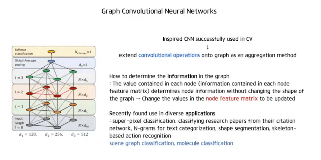 따라서 Graph Convolutional layer가 layer를 거치면 어떤 node의 정보 즉, node feature 매트릭스 안에 있는 value가 업데이트되도록 한다고 생각할 수 있습니다. GCN는 super pixel 분류, citation 네트워크에 따른 논문 분류, 유기 분자의 화학적 특성 예측 등 최근 다양한 응용 분야에 적용되고 있습니다.