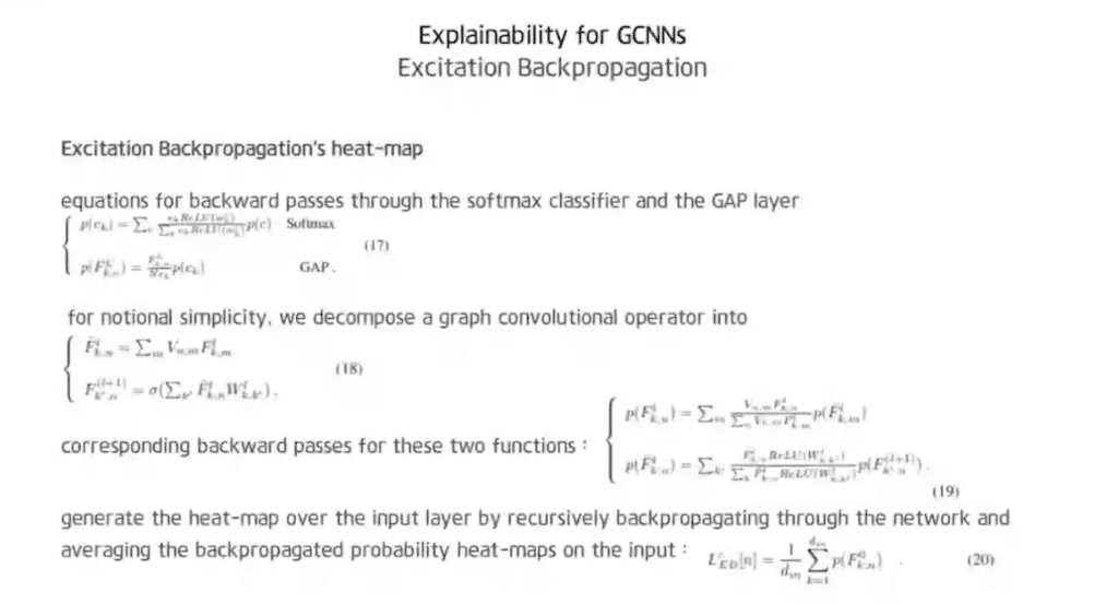 Grad CAM을 사용하면 네트워크에 다른 레이어에 대한 Heat Map도 생성할 수 있습니다. GCN에 대한 excitation back propagation의 heat map은 소프트맥스 classifier GAP 레이어 및 여러 Graph Convolutional 레이어를 통한 backward pass를 통해 계산됩니다. 소프트맥스 classifier와 gap 레이어를 통과하는 backward pass의 수식은 다음과 같습니다. 여기서 관심 class인 경우 pc는 1이고 아닌 경우 0으로 설정합니다.
