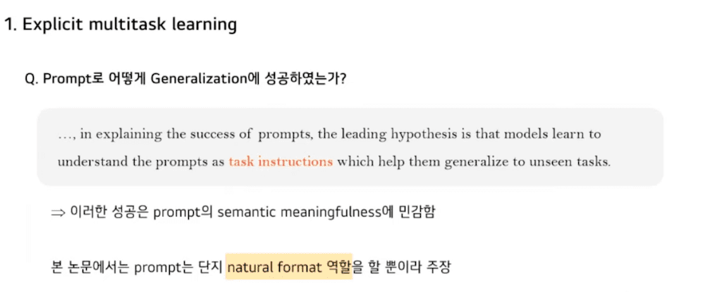 Prompt를 통해 어떻게 일반화에 성공을 하였는가 이 질문에 대해 가장 주력이 되는 가설은 위와 같습니다.