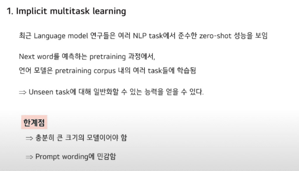 최근 language 모델 연구들은 여러 NLP task에서 준수한 Zero-Shot 성능을 보입니다. Next word를 예측하는 Pre training 과정에서 언어 모델은 Pre training corpus내에 여러 task 즉, Multitask에 의해 학습되며 이로 인해 Unseen task에 대해 일반화할 수 있는 능력을 얻을 수 있습니다. 다만 이때 모델의 크기가 충분히 커야 하며 Prompt wording이 민감하다는 한계점이 있습니다.