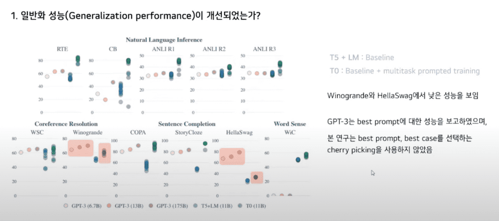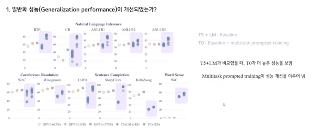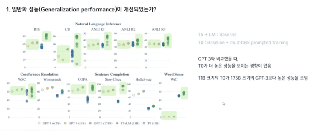 GPT-3와 비교를 했을 때 T0가 더 높은 성능을 보이는 경향이 있습니다. 이때 주목할 점으로 11B T0가 그의 10배에 달하는 GPT-3보다 더 높은 성능을 보이는 것을 확인할 수 있습니다.