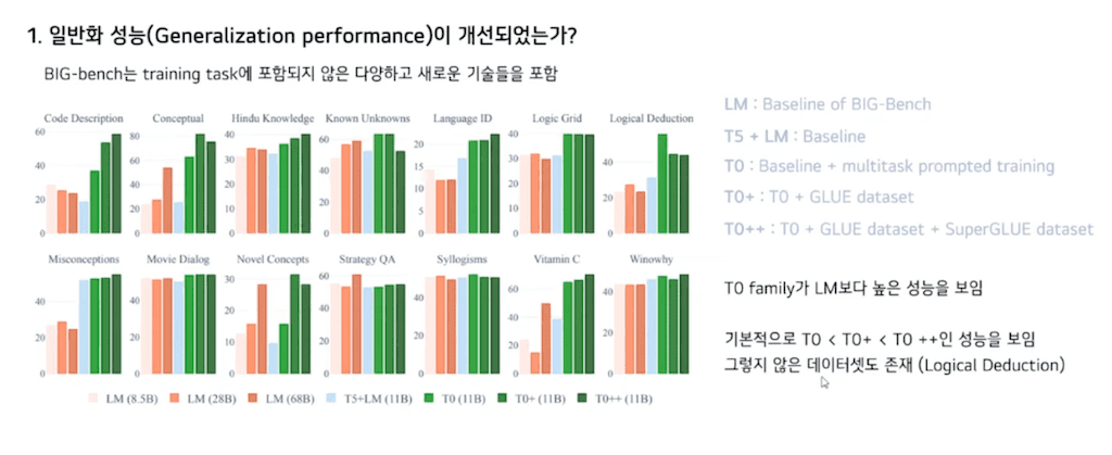 다음은 BIG-bench에 대한 성능입니다. BIG-bench는 training task에 포함되지 않은 다양하고 새로운 기술들을 포함하고 있습니다. 여기서 LM은 BIG-bench에서 제공하는 baseline입니다. 초록색의 T0 family가 LM보다 더 높은 성능을 보이고 있습니다. 또한 기본적으로 T0보다 T0+ 그보다 T0++가 더 높은 성능을 보입니다.
