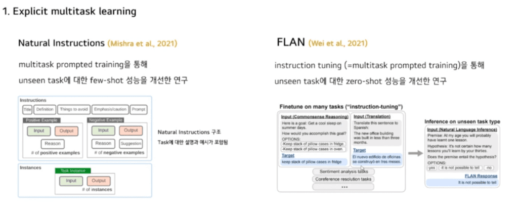 다음은 Explicit multitask learning 연구입니다. Mishra et al는 Multitask Prompt training을 통해 Unseen task에 대하여 few-shot 성능을 개선한 연구를 제안해왔습니다.