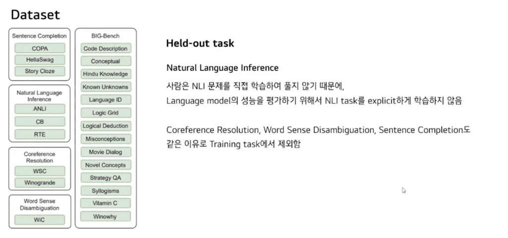 Held-out task입니다. 이때 Natural language Inference에 대해서 사람은 NLI 문제를 직접 학습하여 풀지 않고 기존에 있는 지식들을 위해 추론합니다. 이와 같이 language 모델의 성능 평가하기 위해서 NLI task를 explicit 하게 학습하지 않았습니다. 나머지 task들도 마찬가지로 같은 이유로 training task에서 제외하였습니다.