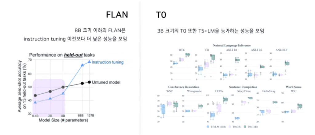 FLAN의 실험 결과에서는 8B 크기 이하의 FLAN instruction tuning 이전보다 instruction tuning을 했을 때 이전보다 더 낮은 성능을 보이는 것을 알 수 있습니다. 그에 비해 T0는 3B 크기의 T0 또한 튜닝을 하기 전 T5+LM을 능가하는 성능을 보이고 있습니다.
