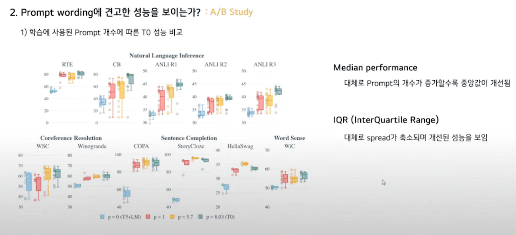 다음은 데이터셋 개수에 따른 성능 비교입니다. 이때 Prompt의 개수는 고정되어 있습니다. IQR이 T0에서 T0+로 갈 때 T0+에서 T0++로 갈 때 IQR이 널뛰거나 중앙값이 낮아지는 등 데이터셋을 늘린다고 성능 개선이 이루어지지는 않았습니다.