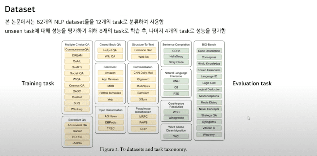 본 논문에서는 62개의 NLP 데이터셋을 12개의 task로 분류하여 사용했습니다. Unseen task에 대해 성능을 평가하기 위해 8개 task로 학습 후 나머지 Held-out task로 성능을 평가했습니다.