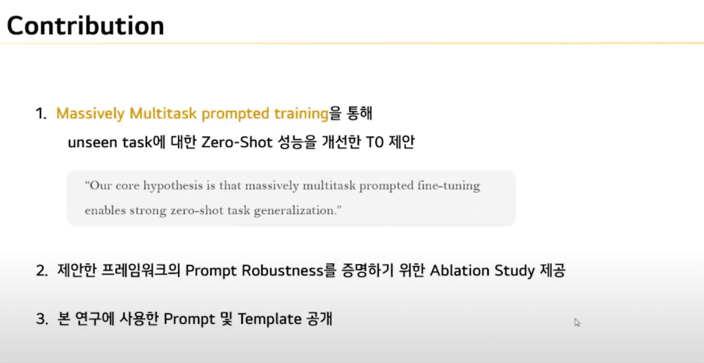 본 연구에서 주력으로 내세우고 있는 가설은 Massively Multitask Prompt의 Fine tuning이 Zero-Shot 일반화 성능을 개선한다라고 주장하고 있습니다. 그에 대한 모델로 T0를 제안하였습니다.
