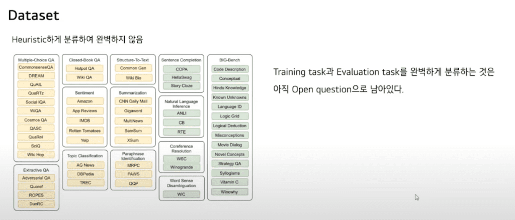 이 분류는 Heuristic 하게 분류하여 완벽하지 않습니다. 사실은 training task와 Evaluation task를 완벽하게 분류하는 것은 아직 Open question으로 남아있다고 합니다.