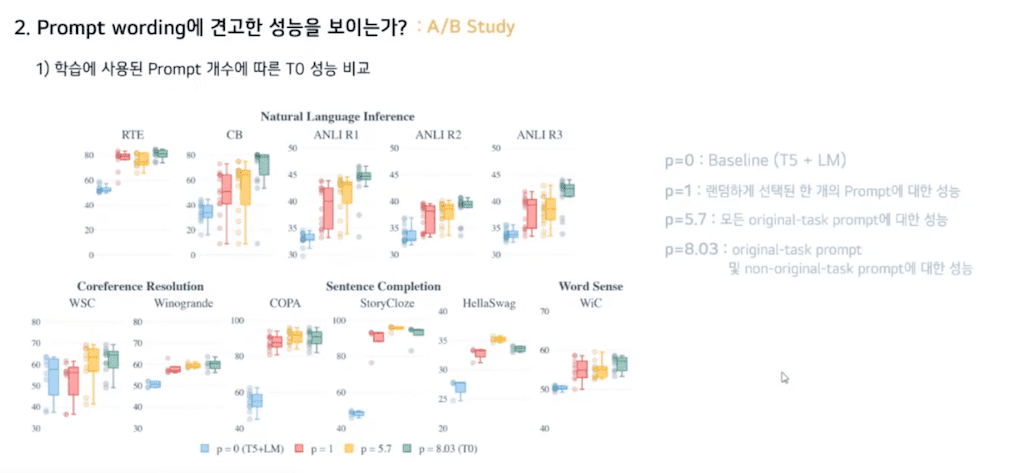먼저 첫 번째로 정말로 Unseen task에 대한 성능을 일반화할 수 있는가에 대한 실험입니다. Held-out task에 대해서 실험을 수행했습니다. 각 점은 Evaluation Prompt에 대한 성능입니다. T5 LM은 LM adapted T5로 베이스라인 모델입니다. LM adapted T5에 비해 T0가 더 높은 성능을 이루는 것을 보아 Multitask Prompt의 training이 성능 개선을 이루어 냈다는 것을 알 수 있습니다.