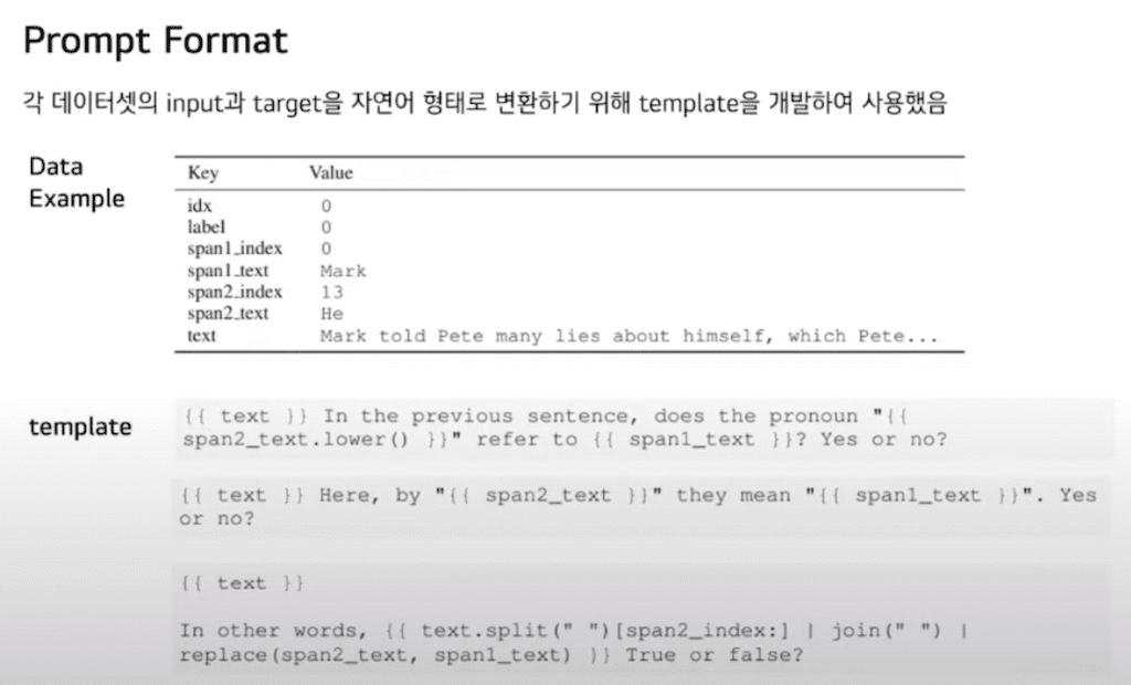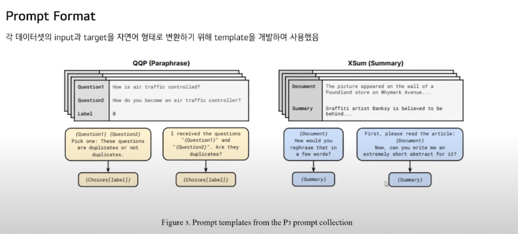 Prompt Format입니다. 각 데이터셋에 Input과 target을 자연어 형태로 변환하기 위해 template를 각 데이터셋당 여러 개씩 개발하였습니다. 이 그림에서 왼쪽 회색이 기존 데이터셋이고 그 아래 여러 개의 template이 존재합니다.