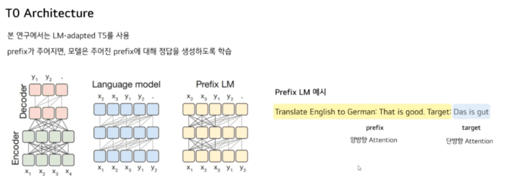 더 구체적으로는 T0 Architecture는 Prompt training 형식에 맞게끔 LM-adapted T5를 사용했습니다. Prefix가 주어지면 모델은 주어진 Prefix에 대한 정답을 이어 쓰도록 학습합니다. 이 예시를 보시면 Translate English to German: That is good. Target이 prefix고 Das is gut이 target입니다.