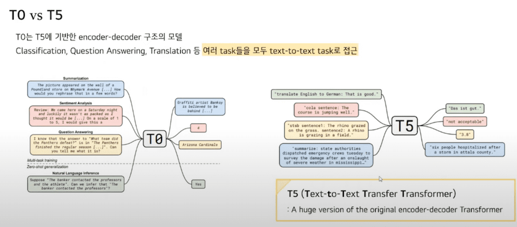 T0는 Unseen task에 대한 Zero-Shot 성능을 일반화하기 위한 모델로 이 그림을 보시면 framework를 이해하실 수 있습니다. 여러 task들에 의해 학습이 되면 Unseen task인 Natural language Inference를 Zero-Shot으로 수행하고 있습니다. 또한 T0는 입력과 출력이 모두 텍스트인 text to text 구조를 띄고 있습니다.
