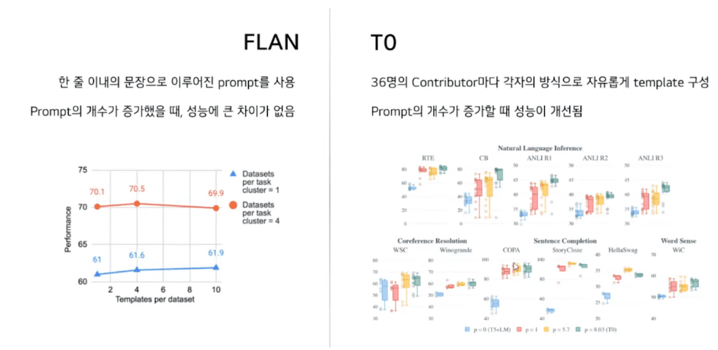 FLAN의 Instruction은 한 줄 이내에 문장을 이루어졌습니다. 이로 인해 Prompt의 다양성을 확보할 수 없고 Prompt의 개수가 증가했을 때 성능에 큰 차이가 없었습니다. 그에 반해 T0는 36명의 contributor마다 각자의 방식으로 자유롭게 Template을 구성하였고 이때 Prompt는 영어를 알 수 있는 사람이라면 누구나 이해할 수 있는 문법적으로 완성도가 있는 그런 Prompt로 각각의 Contributor 마다 자유로운 방식으로 Prompt를 제작했다고 설명하고 있습니다. 아까 실험 결과와 같이 Prompt의 개수가 증가할 때 성능이 개선되는 것을 확인하였습니다.