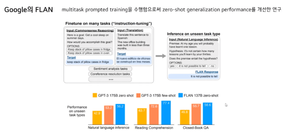 마지막으로 구글의 FLAN입니다. Multitask Prompt의 training을 수행함으로써 Zero-Shot generalization performance를 개선한 연구로 T0와 상당히 유사한 연구입니다.