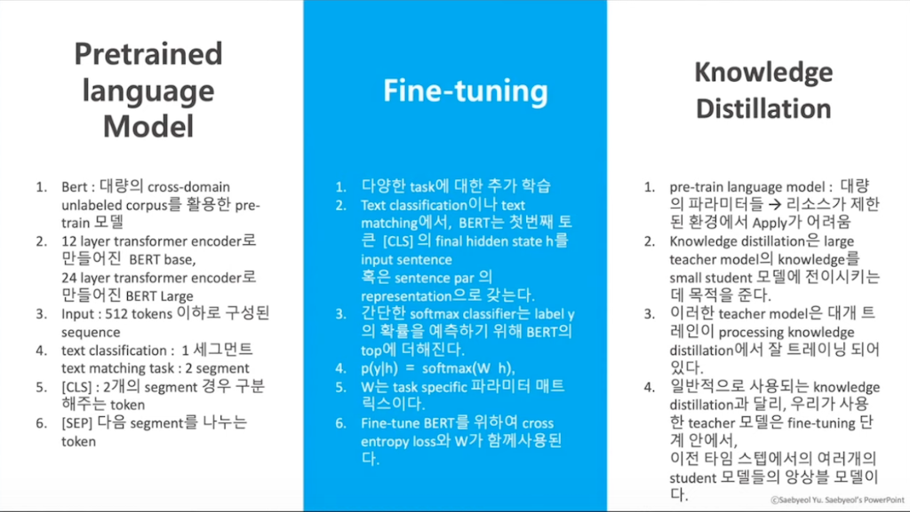 관련 연구에 관해서 살펴보겠습니다. 이 논문에서 두 개의 진행되는 과정인 Pre-trained language 모델과 knowledge Distillation에 대한 더 자세한 설명을 해보겠습니다. Pre-trained 모델은 Pre-trained language 모델 중에 이 논문에 사용된 모델은 ‘BERT’ 모델로, 대량의 다양한 분야의 unlabeled 문장 데이터를 사용해서 학습된 Pre-trained 모델입니다. BERT 베이스 모델은 열두 개의 Transformer encoder, 그리고 BERT 라지 모델은 24개의 Transformer encoder layer로 학습된 모델입니다. 이 두 개의 모델은 동일하게 512개의 토큰을 입력값으로 받고, CLS와 SEP라는 특수한 토큰을 이 입력값에 추가로 삽입해줍니다. CLS는 예를 들면 각 입력값에 시작에 추가가 되는데, classification task 같은 경우에는 입력값의 종류가 하나 이기 때문에, 문장에 첫 시작 부분에 한번 들어가고, 문장 비교와 같은 테스크에서는 문장 1과 문장 2가 각각 시작할 때 CLS가 두 번 들어갑니다. SEP는 각 입력값에 대해서 문장이 여러 개로 이뤄져 있을 때 문장을 구분하는데 추가로 입력됩니다. 이렇게 학습된 Pre-trained 모델을 문장에 입력하면 각 문장은 벡터 형태의 output을 가지게 되는데, 이 벡터에 대한 다양한 테스크를 추가 학습을 하는 과정을 Fine-Tuning이라고 합니다. 이렇게 이 Fine-Tuning 과정은 fully connected layer이기도 한데, 이런 output에 weight값을 곱해주고, 그 결과를 softmax로 결과를 계산합니다. 이 논문에서는 이런 Fine-Tuning을 응용해서 리소스가 제한된 환경에서, teacher 모델이나 teacher 모델을 활용해서, student 모델에 knowledge Distillation 시키는 방법을 사용합니다.