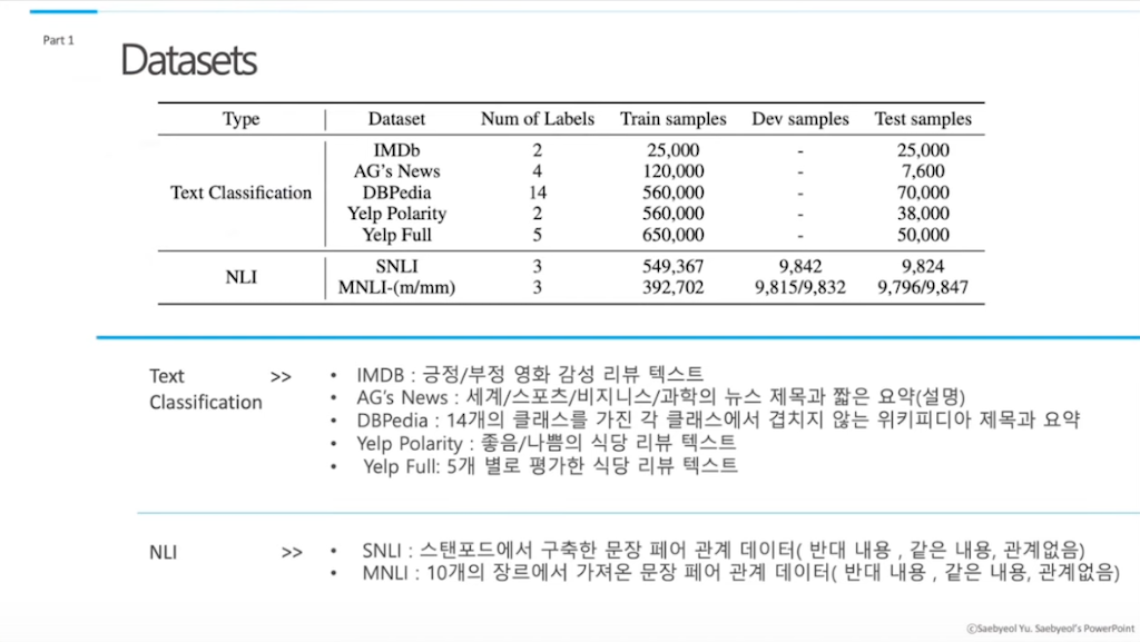 다음으로, experiment 부분에 대해서 설명드리겠습니다. 논문에서 모델을 학습하는 데 사용한 데이터는 크게 두 가지 종류로, text classification과 NLI가 있습니다.