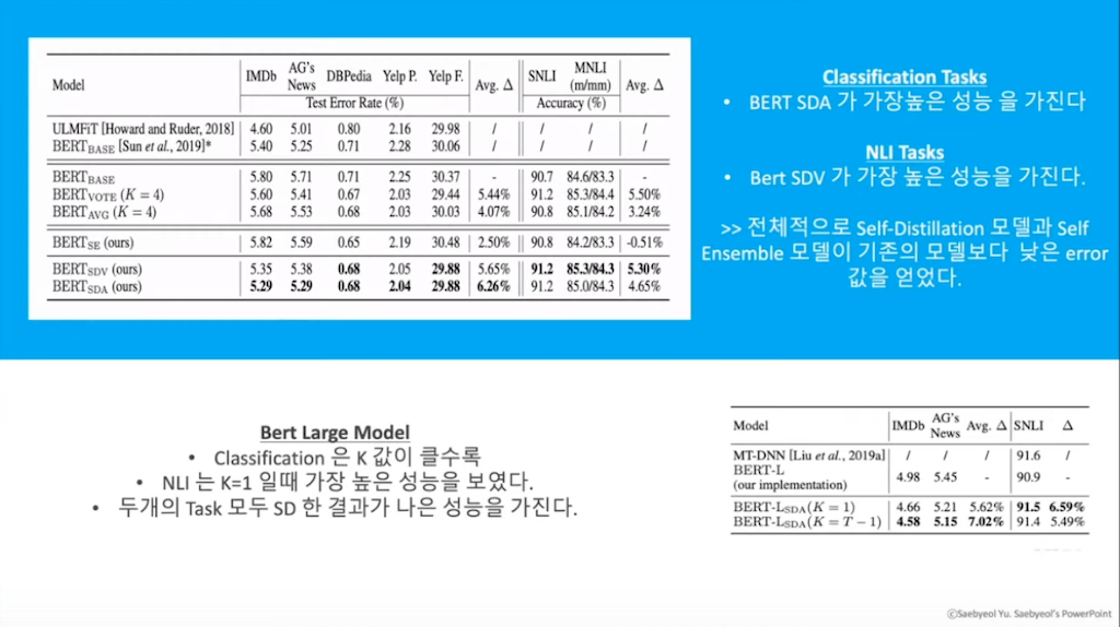 마지막으로 정리하자면, 이 논문의 목표는 추가적인 데이터와 지식 없이 BERT 모델을 Fine-Tuning을 통해서 개선시키는 것입니다. 그 방법으로, Self Ensemble과 Self Distillation을 활용했습니다. 결과적으로는 Self Ensemble 모델은 BERT를 개선시킬 수 있지만, 효율성이 좋지는 않았습니다. Self Distillation 모델은 Fine-Tuning에서 BERT 모델을 이전보다 발전시킬 수 있었습니다.