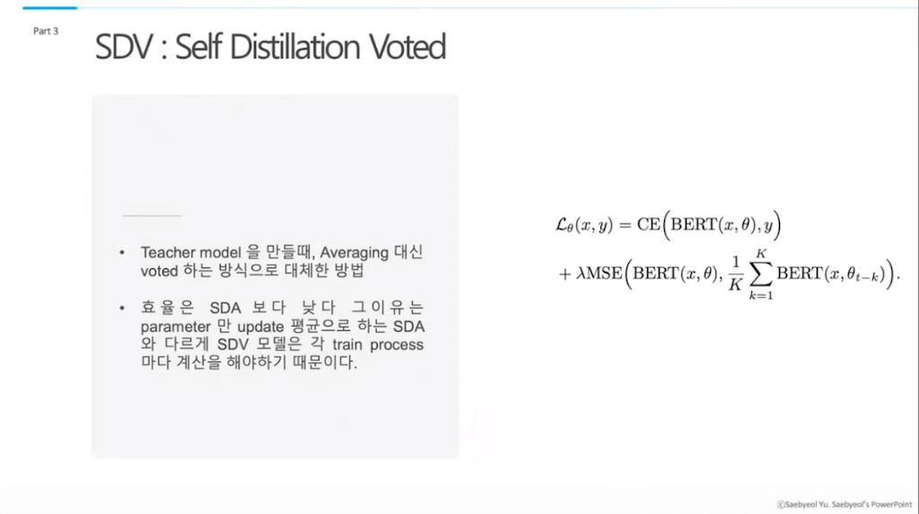 Self Distillation Voted 모델은 파라미터들의 평균이 아닌 파라미터들을 계산했을 때 나오는 최댓값을 가진 probability들을 모읍니다. 그리고 그 베이스 모델과 output을 비교하면서, MSE를 계산하고, 마찬가지로 그 cross entropy값과 더해주어서 weight를 업데이트하는 과정을 거칩니다. Voted BERT가 Average BERT보다 효율이 낮은 이유는, Self Distillation Voted 모델도 매번 output의 probability를 계산하는 과정까지 거쳐야 하기 때문에 계산이 추가로 좀 더 필요하고, 그래서 학습효율이 SDA보다는 조금 떨어집니다.