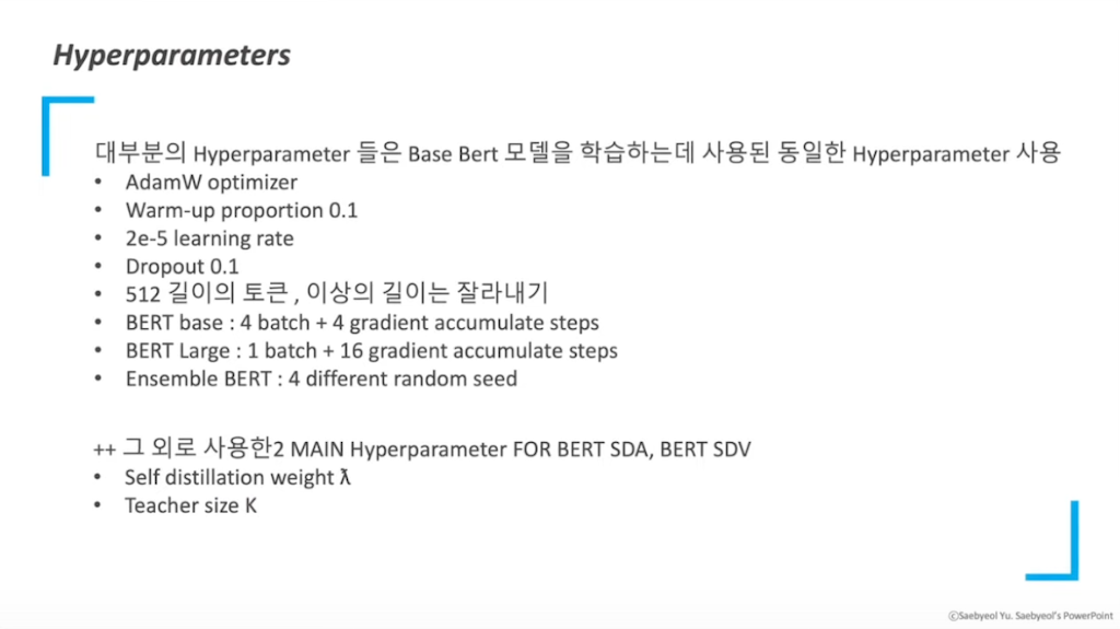 이 논문의 hypterparameter는 BERT 베이스 모델을 학습하는 데 사용한 동일한 hypterparameter를 사용했습니다.