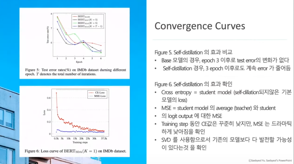 위 표에서, 이 논문에 등장한 모든 논문들을 각각의 데이터의 결과를 모두 비교했을 때, 데이터의 종류에 따라서 차이가 있지만, 전체적으로 Self Distillation 모델들이 기존의 BERT 모델보다 더 나은 오차 오류 값을 가진다는 것을 확인할 수 있습니다.