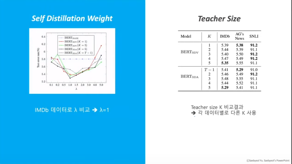 그리고 이렇게 추가로 사용한 hyperparameter들을 비교해 봤을 때, IMDB 데이터에 다양한 BERT 베이스 모델의 람다 값에 변화를 주면서 비교했습니다. 람다 값이 1 일 때 오류 값이 가장 낮음을 확인할 수 있었습니다. 그리고 teacher 사이즈 K에 대해서는 SDE, SDA 둘 다 데이터별로 각각 다른 K를 가질 때, 가장 낮은 오차 값을 가진다는 것을 확인했습니다.