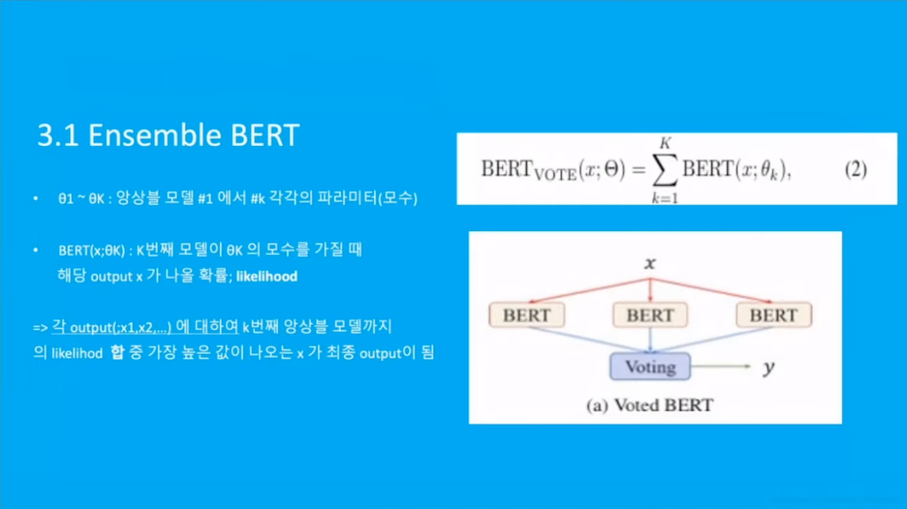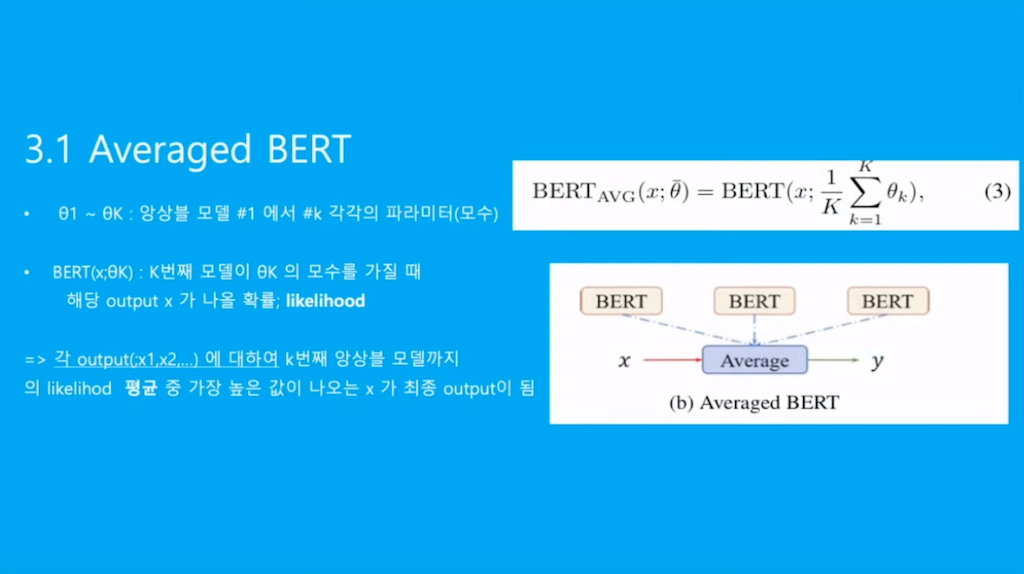 이러한 단점을 줄이기 위해, 다음으로 사용하는 방법은 Average BERT라는 모델의 output을 모델의 output이 아닌 모델의 parameter를 전부 모아서 평균을 낸 후, 그 평균을 낸 파라미터들을 이용해서 최종 output을 계산하는 방법입니다. 하지만 이 방법 역시 parameter값들을 전부 계산하기 때문에, Voted 보다는 계산 양이 적지만 여전히 계산 양이 적지 않다는 단점이 있습니다.