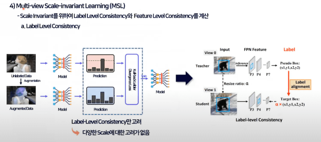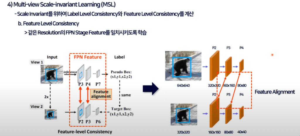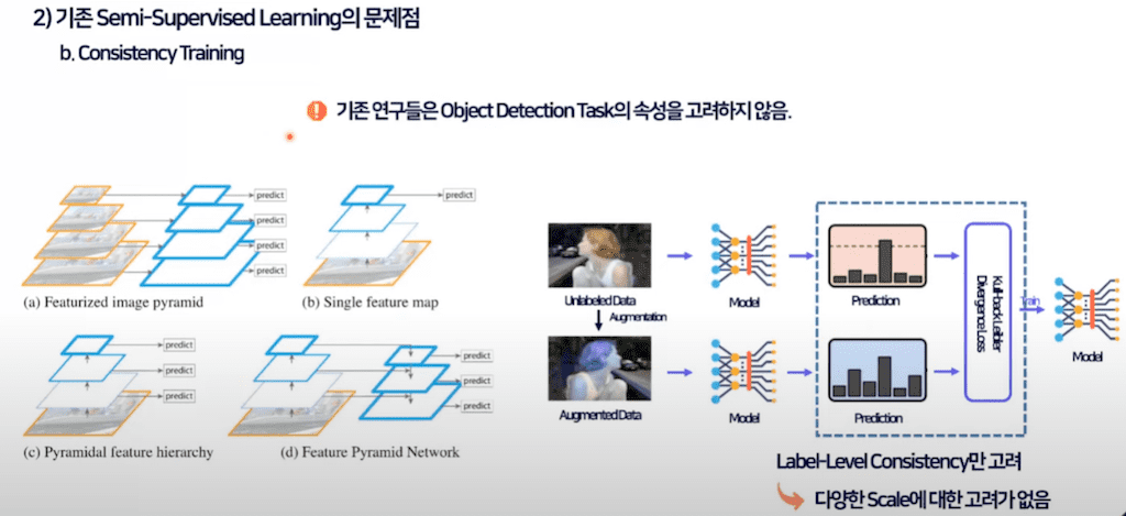 Object detection 같은 경우에는 scale에 invariant 해야 되고 당연히 small Object의 성능을 높이기 위해서 feature 피라미드를 최근에는 당연시하게 사용하고 있습니다. 이처럼 detection task에서 사용되는 FPN처럼 스케일을 고려한 학습 방법이 기존의 Consistency learning에는 없다는 것이 문제입니다.