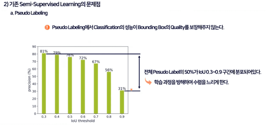 이러한 Pseudo labeling은 classification이 집중된 방법이라고 얘기를 합니다. Pseudo labeling 기법을 통해 만든 Pseudo label을 분석해서 classification 성능 지표인 precision과 Iou Threshold 관계를 보면 iou가 0.9일 경우에 precision이 31 퍼센트밖에 되지 않습니다. 0.3일 때는 81퍼센트 수준입니다. Iou Threshold가 높아질수록 급격하게 precision은 떨어지게 됩니다.