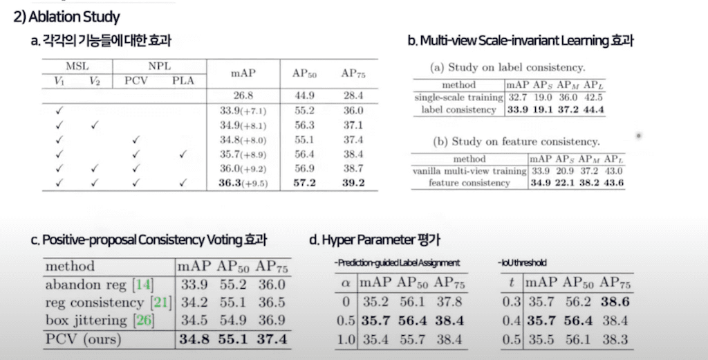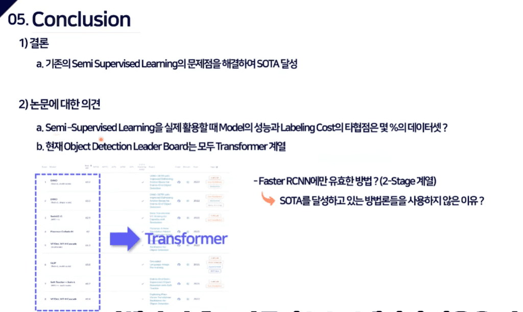 게다가 본 논문에서 설명하는 것이 label 데이터를 학습하고 unlabel 데이터를 추가로 학습을 했더니 성능이 올라갔다는 부분도 있었는데 Faster R-CNN으로만 검증을 하고 다른 트랜스포머 기반의 모델에서는 하나도 검증 안 했다는 것은 조금 의문이 들었습니다.