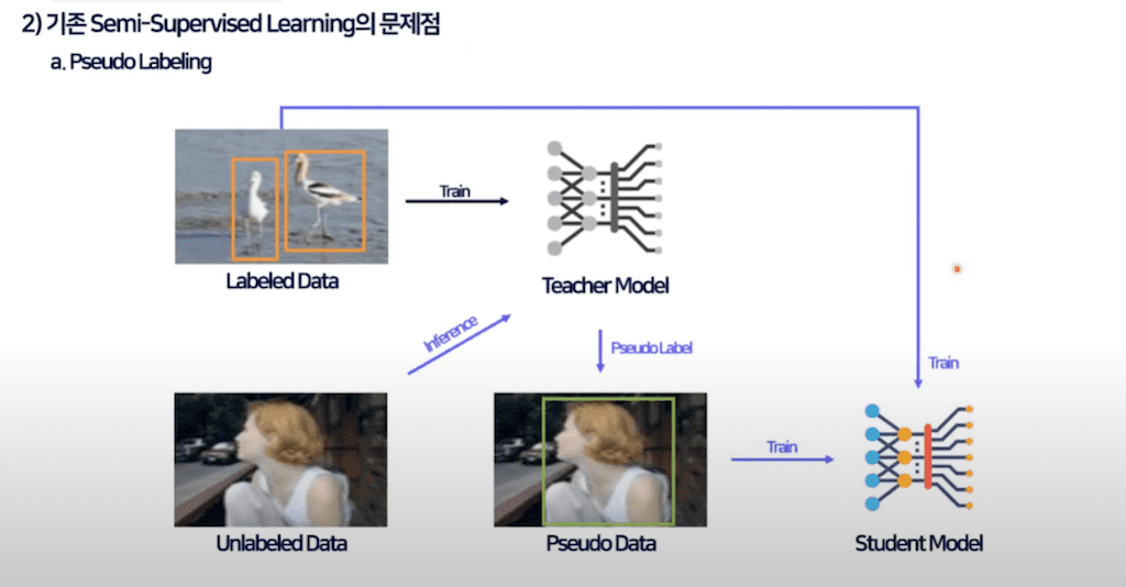 저자는 기존의 Semi-Supervised learning의 대표적인 방법인 Pseudo labeling과 Consistency 트레이닝 방법에 대해서 얘기를 합니다.