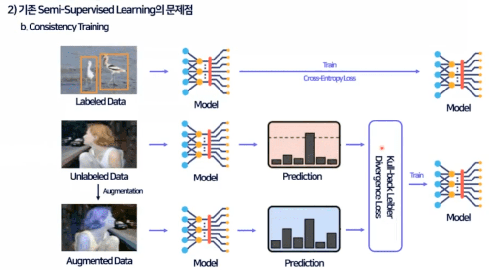 label 데이터는 Supervised모델을 학습을 하게 되고 unlabel 데이터는 augmentation을 진행한 뒤 두 개의 이미지 모두 모델의 입력으로 활용을 하게 됩니다.