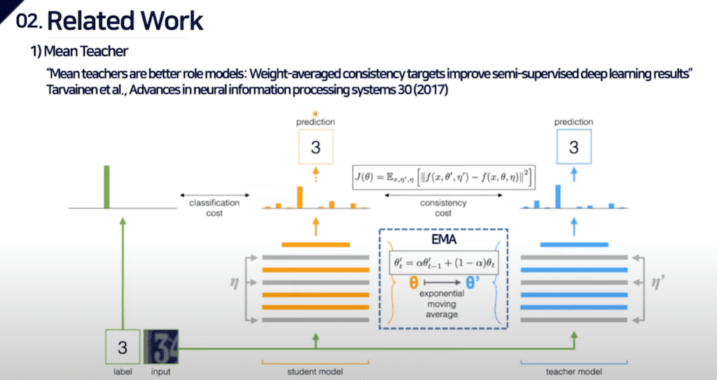 다음은 Related work 부분입니다. 본 논문의 method을 설명하기에 앞서서 관련 임무들을 좀 설명을 드리자면 먼저 mean teacher를 얘기할 수 있습니다. mean teacher의 경우에는 teacher 모델을 student 모델의 웨이트를 활용하는 방법으로 사용하게 됩니다.