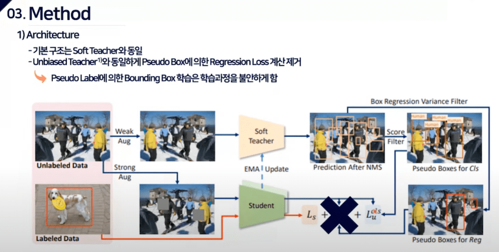 방금 말씀드렸다시피 기본 구조는 Soft teacher와 동일합니다. 다만 unbiased teacher라는 논문에서 Pseudo 박스를 이용한 box regression loss를 삭제를 하게 됩니다. 그 부분을 본 논문에서도 활용을 하게 됩니다. 이런 box regression loss를 삭제하는 이유는 Pseudo label에 의해 생성된 bounding box는 퀄리티 문제로 학습과정에서 unstable을 야기하기 때문에 사용하지 않는다고 저자는 설명을 하고 있습니다.