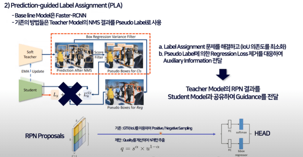 기본적으로 본 논문의 네트워크는 Faster R-CNN을 사용하게 되고 기존의 방법들은 아까 말씀드렸다시피 teacher 모델의 NMS 결과를 활용을 하게 됩니다. 위에서 언급했듯이 Pseudo label을 이용한 box regression은 학습 과정을 불안하게 해서 해당 loss 텀을 삭제를 했기 때문에 teacher 모델의 bounding box 성능과 관련된 information이 전달이 되지 않습니다. 그래서 이런 문제를 해결하고자 teacher 모델의 RPN 결과를 스튜던트 모델의 RPN 결과와 공유해서 Guidance를 전달할 수 있게 했습니다.
