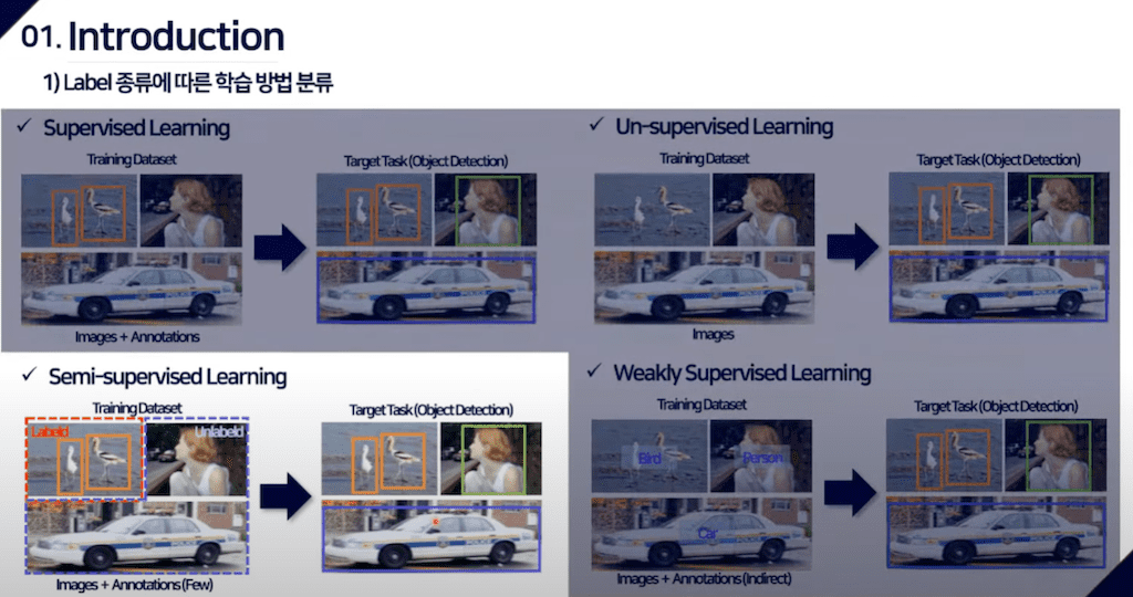 먼저 Introduction입니다. 기본적인 내용부터 간단하게 짚고 넘어가도록 하겠습니다. label 종류에 따라서 학습 방법으로 Supervised learning, UnSupervised, Semi-Supervised, Weakly-Supervised learning이 있습니다.