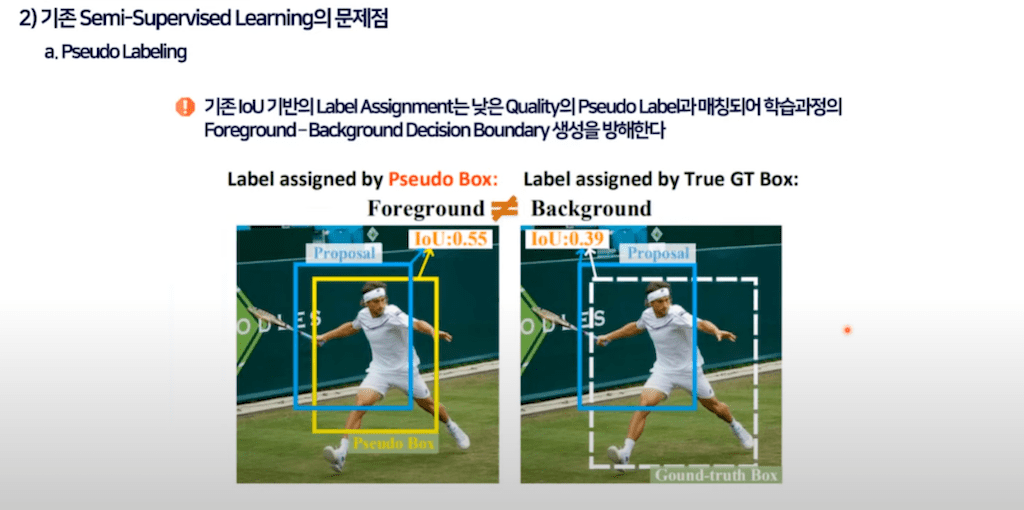 이렇게 bounding box 퀄리티가 좋지 않은 Pseudo label의 경우에는 label assignment에서도 문제를 야기시킵니다. 왼쪽 그림을 보면 proposal 박스와 GT를 비교했을 때 iou가 0.39로 낮은 수치이기 때문에 매칭이 되지 않아야 정상이고 그에 따라 백그라운드로 할당이 되어야 하지만 낮은 퀄리티의 Pseudo label과 매칭이 되는 경우에는 IoU가 0.55가 되고 Foreground로 할당이 될 수 있습니다.