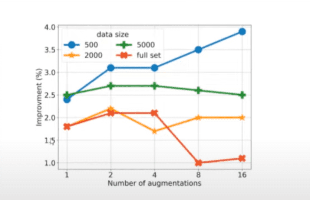 그래서 해당 논문에서는 Augmentation을 몇 번 해주는 것에 따라 얼마만큼의 성능향상이 이루어지냐에 대해서 실험을 해봤습니다. 사실 데이터 사이즈가 작을 때 Augmentation을 많이 해줄수록성능 향상이 올라가는 것을 볼 수 있고 데이터 셋이 많을수록 그 성능 향상의 폭이 좀 작아지는 것을 확인할 수 있습니다.