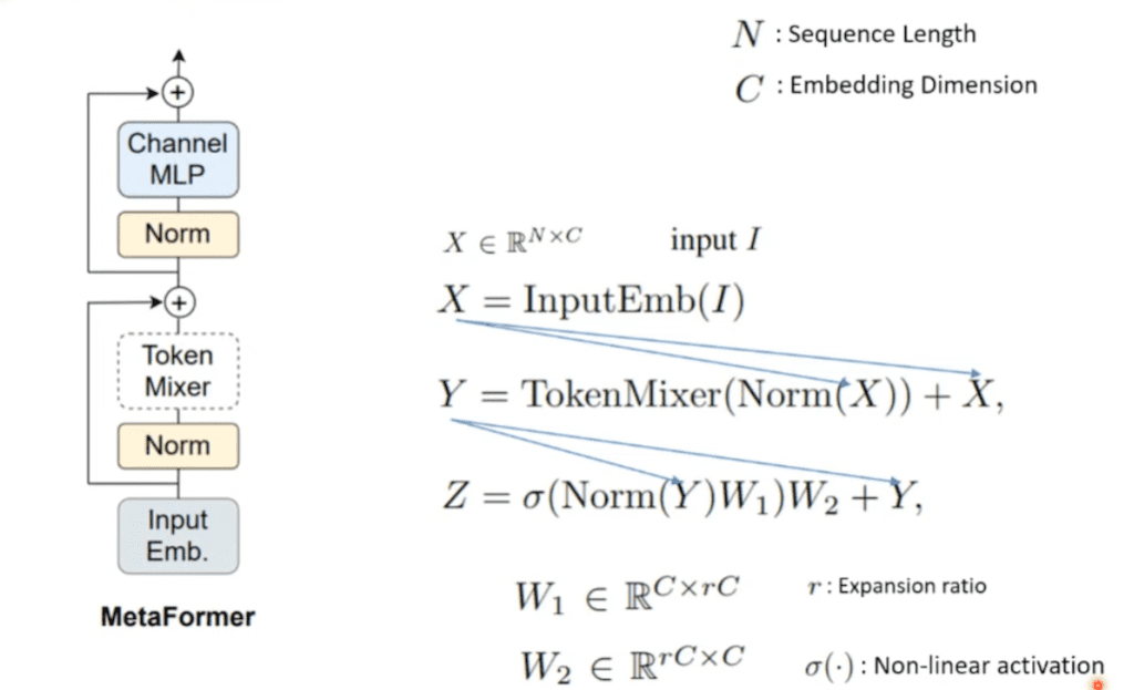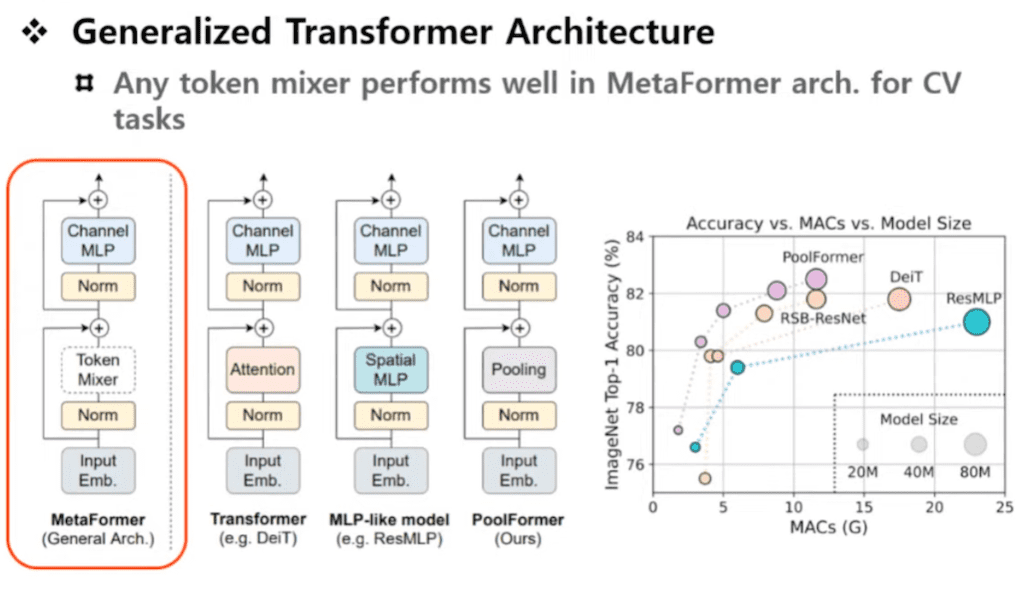 간단하게 표현을 하면은 일반화된 트랜스포머 구조 정도로 이해해 주시면 될 거 같습니다. 왼쪽에 보시면 저자들이 제안하는 것처럼 token mixer 부분이 아무 영상이나 와도 되는 그런 형태로 MetaFormer가 제안이 되어 있습니다.